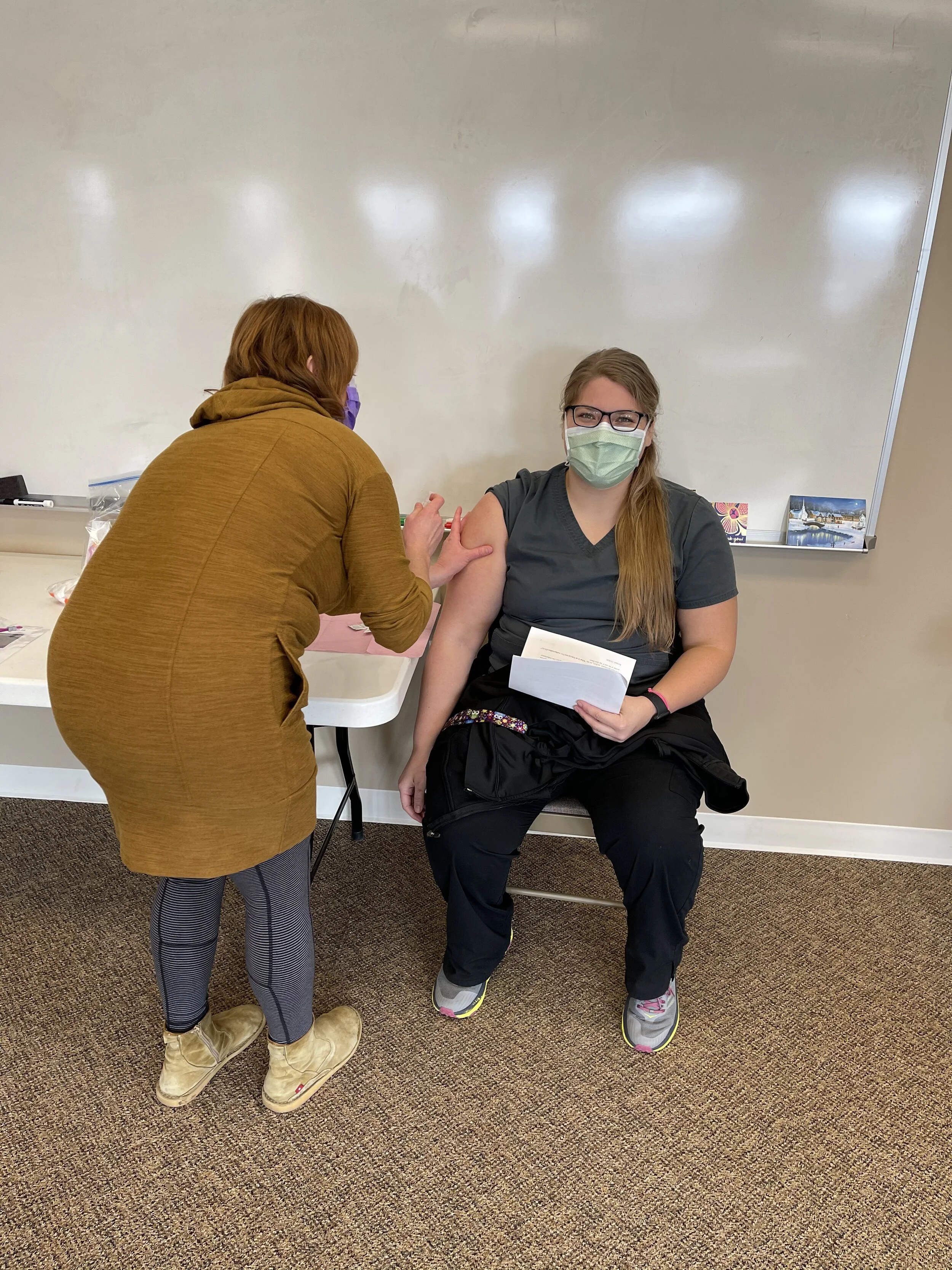 Physician’s Assistant Dani Sperry of South Gilliam Health Center gets a COVID-19 vaccine from Grace Anderson, a registered nurse with North Central Public Health District.